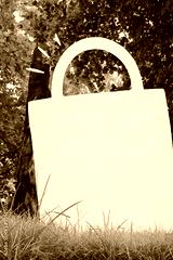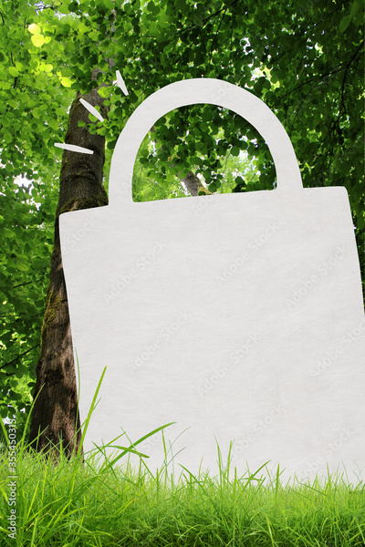 Sac toile de jute dans la nature, arbres, forêt, avec espace pour texte.