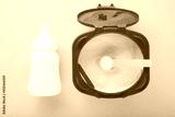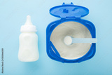 Bottle of white milk and opened container of powder with spoon on light blue table background. Baby feeding concept. Pastel color. Closeup. Top down view.