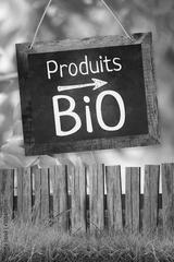 Tableau noir dans l'herbe, arrière-plan nature, feuillage arbre, produits bio