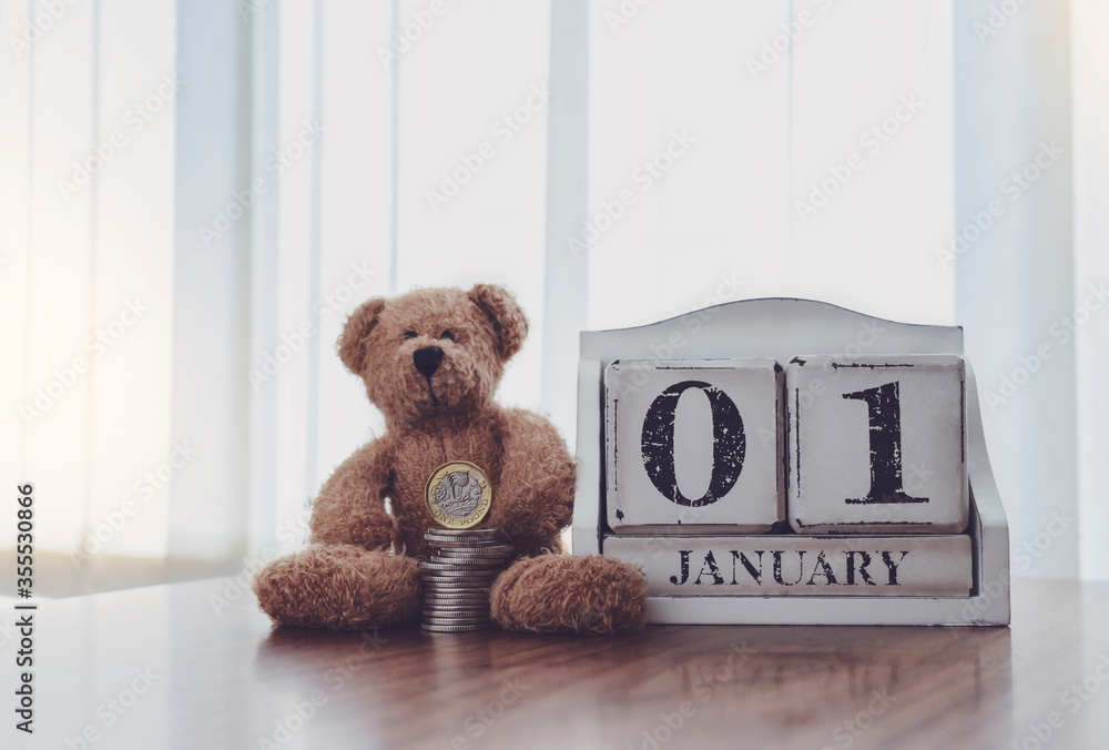 First of January with teddy bear and stack pound coin,Financial planing for New Yew 2021,New Year resolution for saving money for the future in business or personal life concept for holiday background