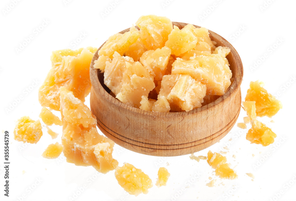 Parmesan cheese in wooden bowl isolated on white background