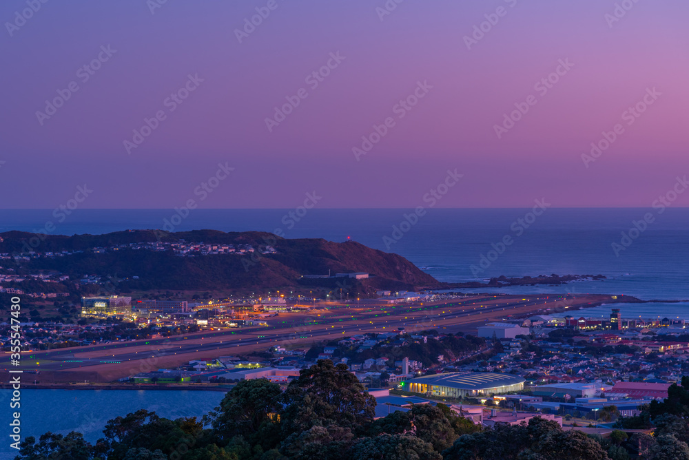Sunset aerial view of Wellington International airport in New Zealand