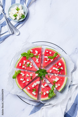 Watermelon pizza with feta cheese and herbs on a table