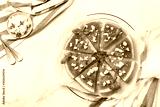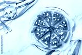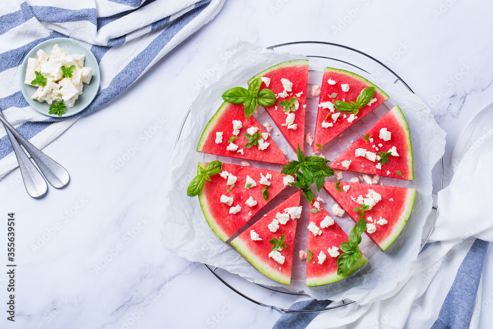Watermelon pizza with feta cheese and herbs on a table