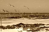 Beautiful and deserted beaches, the amazing waters of the Arabian Sea, super swimming in the sea can be enjoyed on the Oman Island of Masirah. The birds swim above the sea.Oman, Asia