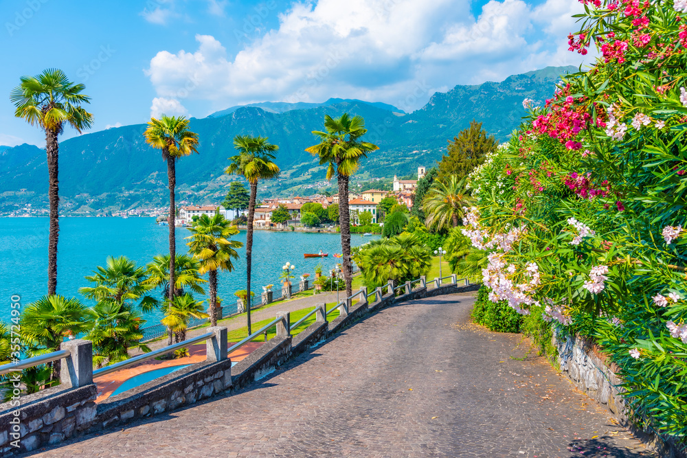 Sulzano viewed behind a garden at lake Iseo, Italy