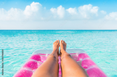 Summer relax vacation woman pov of legs relaxing on pink inflatable pool toy float floating in turquoise water ocean background. Suntan at tropical beach.
