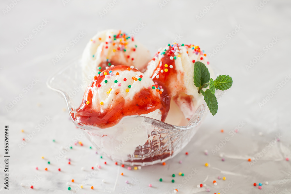 ice cream with strawberry syrup in an ice-cream bowl on a table, selective focus