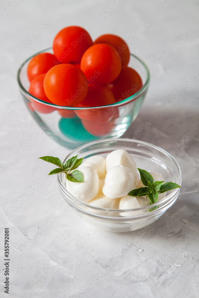 ingredients for salad - cheese, a tomato, olives and oil. selective focus