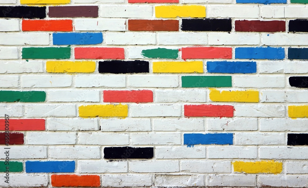 White brick wall, with some bricks painted randomly with other colors. Background and texture