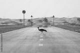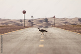Endangered bustard crossing the road in the Dubai desert with sand dunes in background