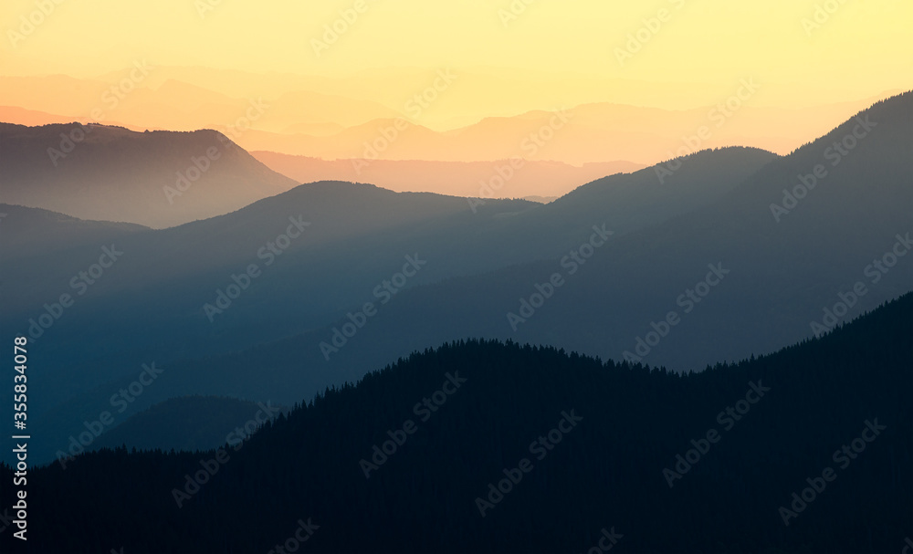 Mountain valley during sunrise. Sun shine in the morning. Natural landscape at the summer time. View from high mountains. Travel image
