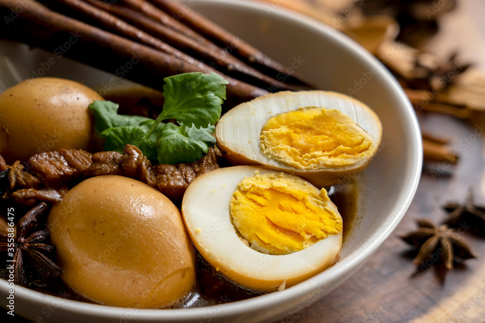 Homemade food, Stewed pork and Eggs with herb in sweet brown soup, Thai traditional food, Local or Street food favourite menu in Thailand. Thai name is Khai palo