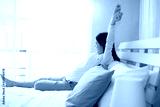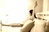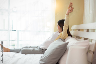 Young beautiful pregnant asia woman wake up in the morning with freshness on bed and streching after get up from her bed with good health of fetus or baby and mother. Attractive pregnancy asian girl