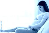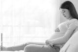 Happy pregnant mother touching and looking beautiful belly sitting on cozy bed at home. prenatal, pregnancy, motherhood, expect concept. Young pregnance girl care and love her baby. copy space