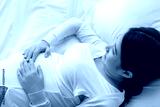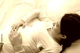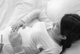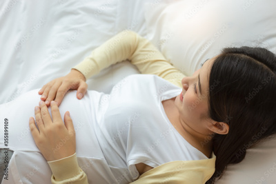 Happy pregnant mother touching beautiful belly laying down in cozy bed at home. prenatal, pregnancy, motherhood, expectation concept Young pregnancy asian girl get happiness, smile face. Mom love baby