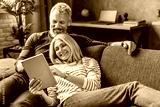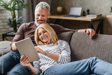 Happy senior couple using digital tablet on sofa indoors