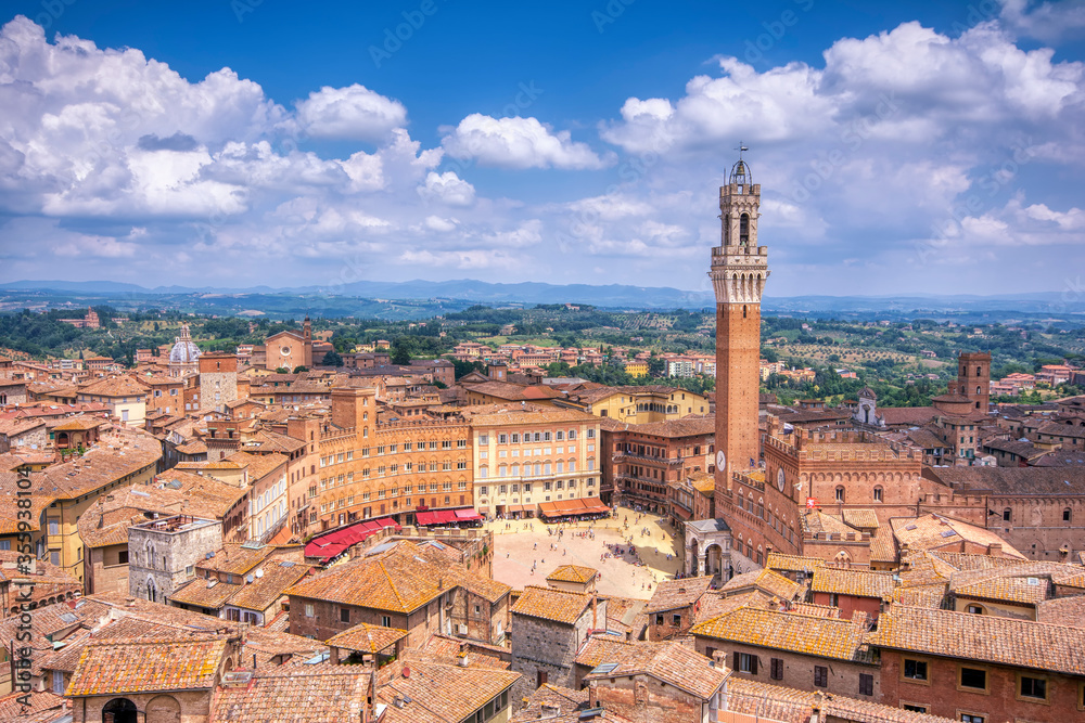 Piazza del Campo with The Torre del Mangia tower in Siena.