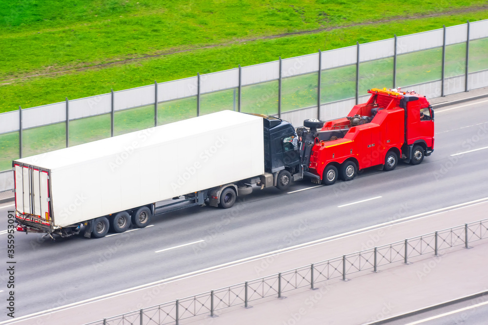 Powerful big rig semi truck tractor tows with attached broken evacuated truck with container trailer driving on city highway, aerial view.