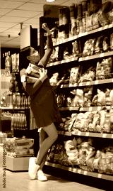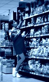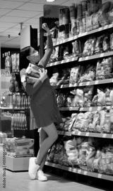 Beautiful girl picking up a packages of potato chips in the supermarket. She is dressed in a bright red dress and medical protective mask