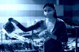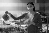 Beautiful brunette girl picking up a pack of sliced meat in the supermarket. She is dressed in a red dress and medical protective mask