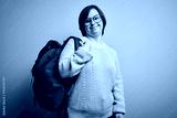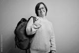 Young down syndrome student woman wearing school bag over yellow background with a happy face standing and smiling with a confident smile showing teeth