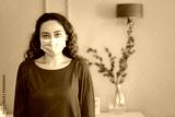 Young woman wearing a mask to protect herself against the coronavirus at home