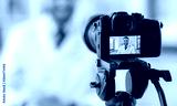 healthcare, medicine and blogging concept - happy smiling male doctor with camera recording video blog at hospital