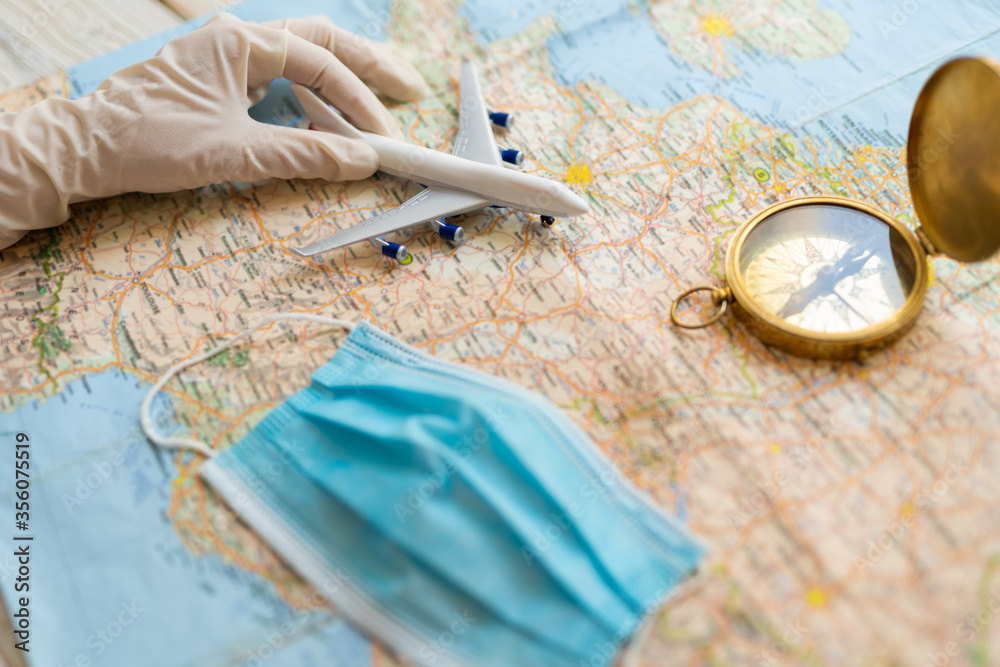 airplane taking off. travel agency working table. map, toy plane, compass, face mask and trip planning after quarantine restrictions due to epidemic covid corona virus. Tourism industry crisis bans
