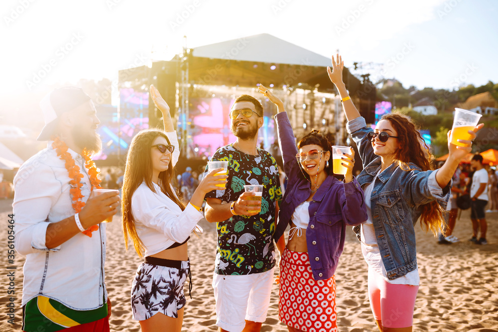 Group of friends with beer dancing and having fun at music festival together. Summer Beach party, holiday, vacation concept.Youth and celebration concept.