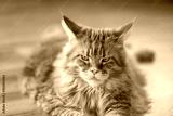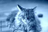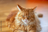 Red maine coon cat laying on the floor and looking at the camera
