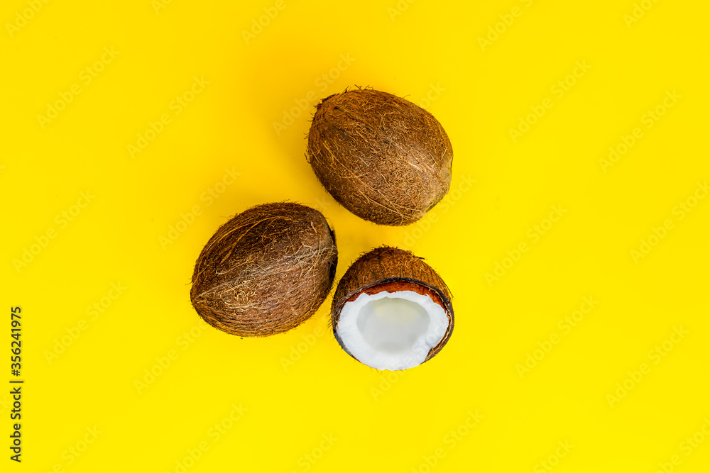 Top view half and two whole coconuts on a yellow background. Tropical summer mockup. Minimal flatlay. Natural ingredient for food and skincare beauty. Copy space.