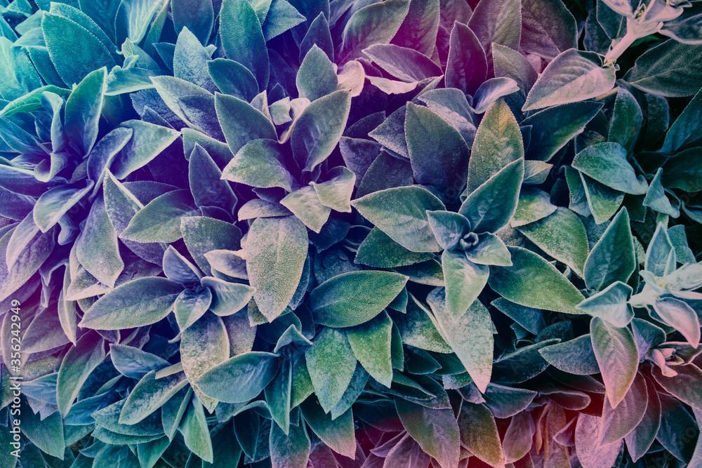 Neon, the holographic effect on green foliage background. Modern futuristic concept. Selective focus