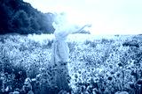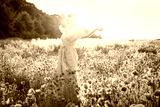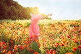 A happy young woman in a pink dress with raised arms relaxing in red poppies flowers meadow in sunset light. A simple pleasure for mental health. Nature relaxation. Selective focus. Copy space.