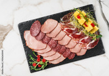 Antipasto platter cold meat with prosciutto, slices ham, beef jerky, salami, sausage on slate stone board over marble background. Meat appetizer