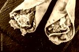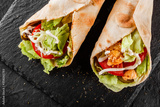 Two Tortilla wraps with grilled chicken fillet, fresh vegetables and salad on black stone background. Healthy snack or take-away lunch