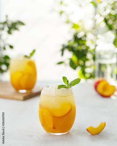 Summer cold drinks: homemade peach cocktail with ice cubes, and mint in glass. Refreshing summer homemade non-alcoholic cocktails. Selective focus