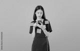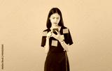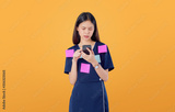 Unhappy young Asian woman holding smartphone isolated on light orange background.