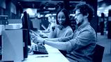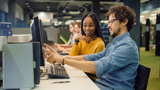 University Library: Bright Black Girl and Smart Hispanic Boy Together Work on Computers, Chat, Discuss Class Assignment, Explain and Advice Each Other. Diverse Group of Students Exam Study Teamwork