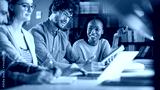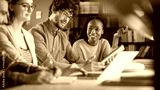 University Library: Diverse Group of Gifted Students Have Discussion, use Laptop, Prepare for Exams Together, Helping, Researching Subjects for Paper Assignment. Happy Young People Study for Future