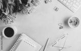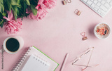 Office feminine desk workspace with pink peony, keyboard, cup of coffee, cosmetics, glasses, lipstick, empty notebook on white background.