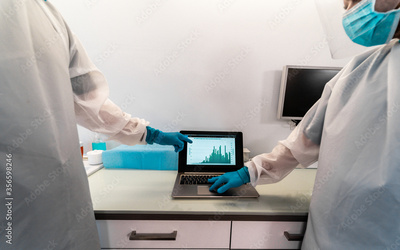 Medical workers in hazmat suit looking laptop computer for checking coronavirus cases - Doctors with protective face masks talking about contagion peak inside hospital room - Main focus on left hand
