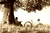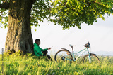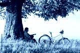 A lonely girl sits under a big old tree near a bicycle. Green summer landscape on city contrside
