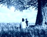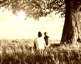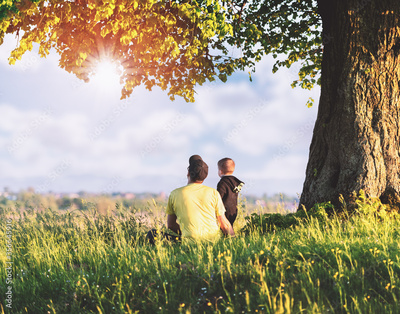 Dad with son in the spring meadow sitting under the tree in tall grass. Travel with child concept