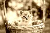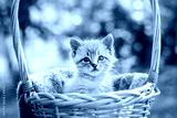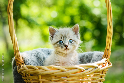 Small kitten cat with blue ayes in basket on garden closeup. Animal pets photography
