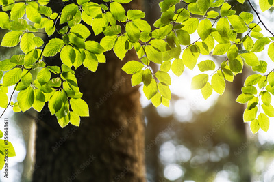 Closeup nature view of green beech leaf on spring twigs on blurred background in forest. Copyspace make using as natural green plants and ecology backdrop