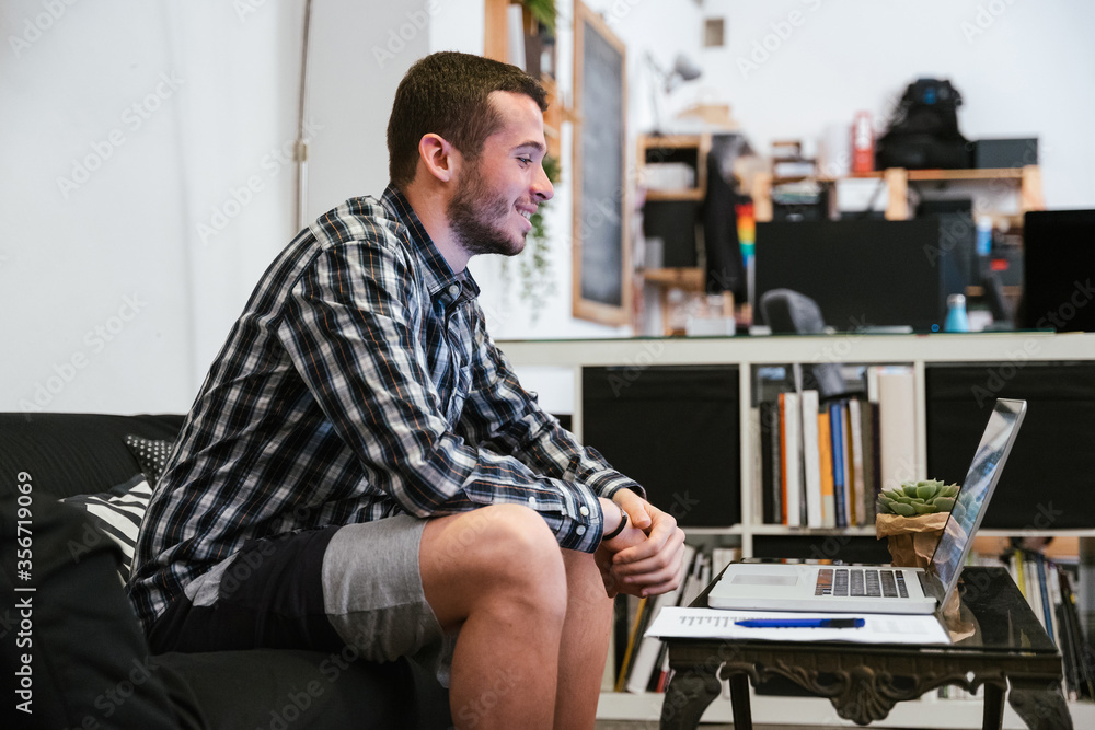 Young man with shirt and shorts in a video call conference at laptop on the sofa with his bosses of work at distance for avoid contamination from Coronavirus, Covid-19 Millennial smiling and speaking