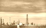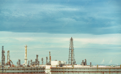 Oil refinery or petroleum refinery plant. Power and energy industry. Oil and gas production plant. Petrochemical plant. Chemical pipeline. Natural gas storage tank with sky. Petroleum engineering.