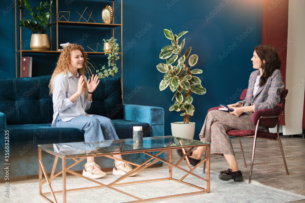 Happy red-haired woman talking to a female psychologist. Discusses her problems, mental trauma. Consultation in the office on the sofa. Positive mood.