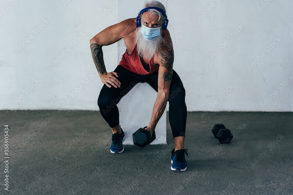 Senior man doing gym workout with dumbbells while wearing face protective mask during Coronavirus isolation quarantine - Fitness, sport and healthy elderly lifestyle - Focus on face